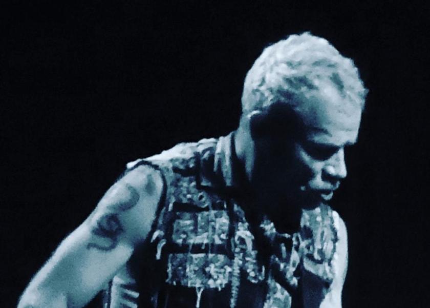 - Black and white image of Flea onstage via Wikimedia Commons.