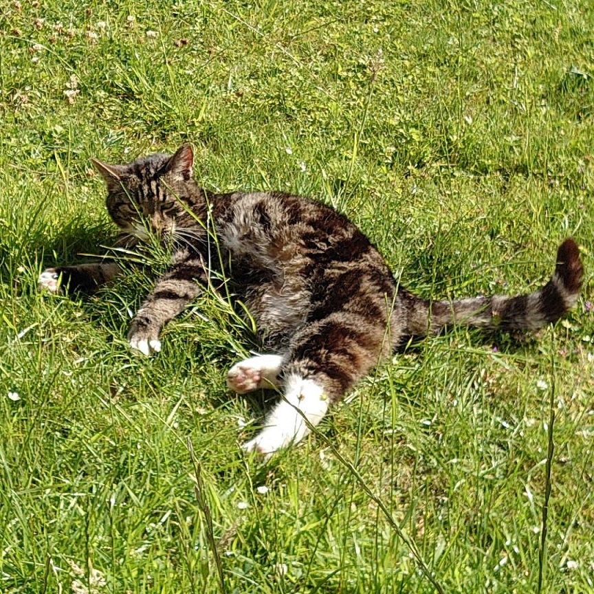 This local feline is a frequent visitor to our garden, and is captured here midway through a languorous roll around on our lawn in the early morning sunshine during the early July heatwave.