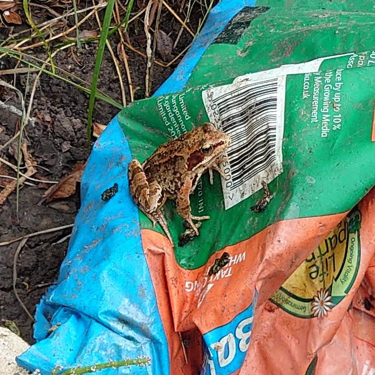 A tiny froglet, perched not upon a lily pad, but on a bag of compost in my garden.