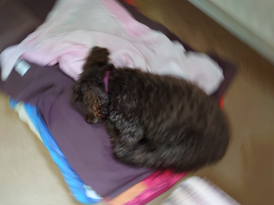Let sleeping Megs lie. We had the privilege of looking after the lovely Meg today. I like the accidental swirling effect that some kind of jolt to my phone must have serendipitously created while I was taking this snap.